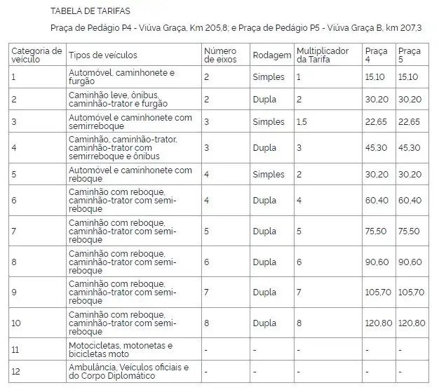 De acordo com o documento, a cobrança de tarifas começou a ser feita a partir da 0h desta quarta-feira, 1º de março, nas praças de pedágio de P4 e P5, “Viúva Graça” e “Viúva Graça B”. A Deliberação determina ainda um reajuste de 9,12% no valor da tarifa, referente à variação do Índice Nacional de Preço ao Consumidor Amplo (IPCA). Com isso, a Tarifa Básica de Pedágio (TBP) terá valor de R$ 15,10, conforme tabela abaixo: