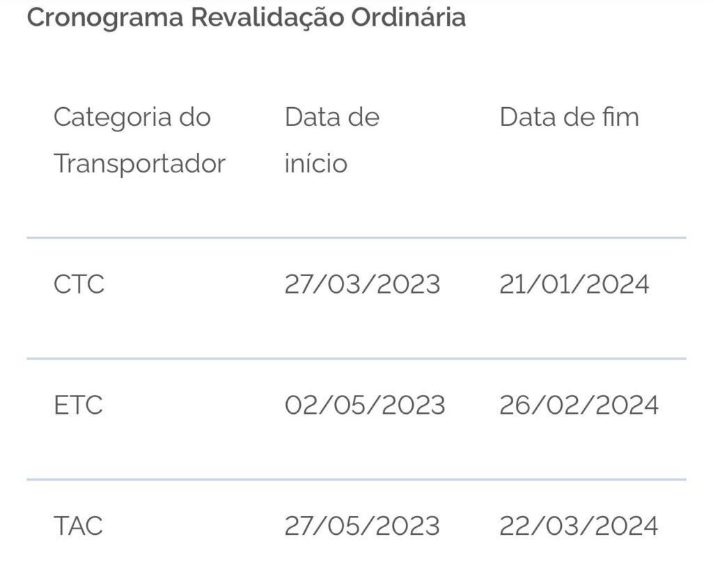 Os transportadores das categorias Transportador Autônomo de Cargas (TAC), Empresa de Transporte de Cargas (ETC) e Cooperativa de Transporte de Cargas (CTC), que estejam com o registro na situação “ativo”, “pendente” ou “suspenso” deverão observar os procedimentos da Revalidação Ordinária.