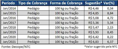 Para 2021, segundo os cálculos do DECOPE, a taxa de pedágio para cada 100 kg ou fração deveria ser de R$ 6,83 já com um reajusta 6,37% referente ao índice de variação de preço de pedágio.