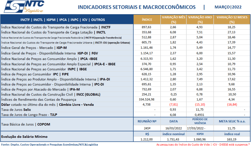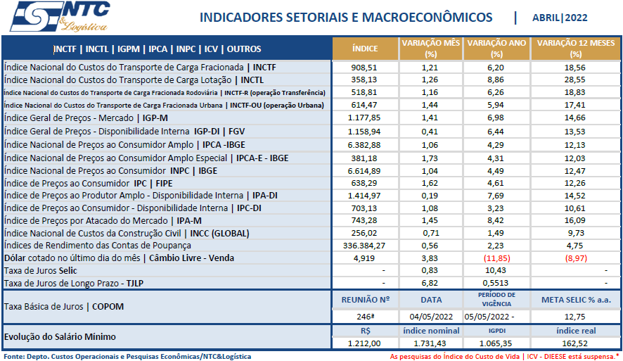 Esses indicadores setoriais e macroeconômicos permitem aos empresários, principalmente, os de transporte, o acompanhamento da evolução da inflação no setor do transporte rodoviário de cargas, e, sobretudo, dos principais indicadores macroeconômicos para a tomada de decisão.