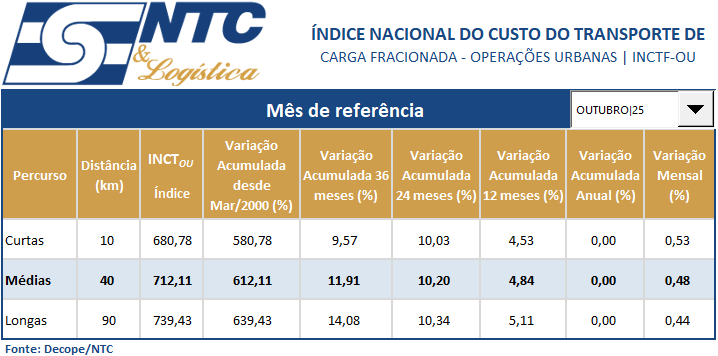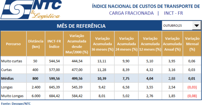 A NTC&LOGÍSTICA comunica aos associados que a variação média do (INCTF[1] DECOPE/NTC) foi de 0,10% no mês de outubro e acumula nos últimos doze meses 4,19%(quatro virgula dezenove por cento), entre novembro de 2024 e outubro de 2025 (outubro de 2025*/- sobre outubro de 2024 ou ainda, nos últimos doze meses).