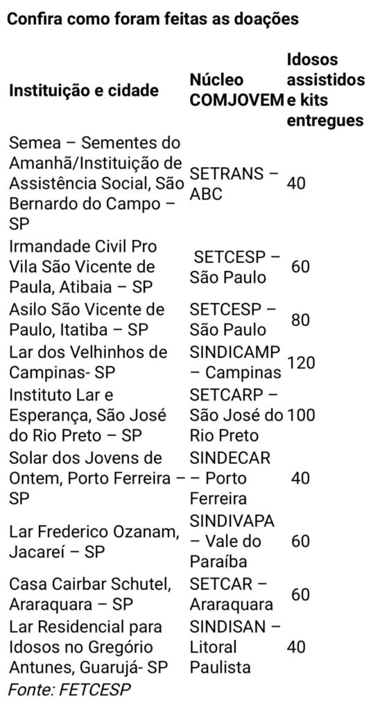 Na quarta-feira (12), a COMJOVEM do Sindecar (Sindicato de Porto Ferreira) entregou os kits para o Solar dos Jovens de Ontem, que fica em Porto Ferreira. Na quinta-feira (13), a COMJOVEM ABC entregou para a Semea – Sementes do Amanhã/Instituição de Assistência Social.