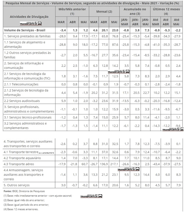 Os segmentos de transportes de carga e de apoio logístico mantiveram o bom desempenho iniciado em meados de 2020, ao passo que o transporte de passageiros se beneficia agora da baixa base de comparação, já que em maio do ano passado, em função da reduzida mobilidade da população, houve quedas expressivas nas receitas das empresas desses segmentos (rodoviário, aéreo e metroferroviário).