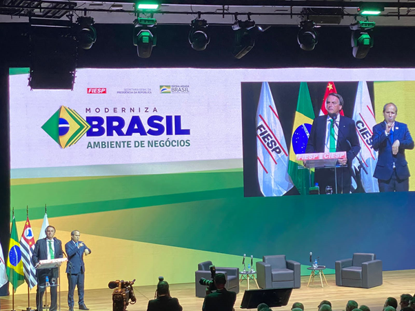 O presidente Francisco Pelucio participou, ontem (15), do Fórum Moderniza Brasil, na sede da Federação das Indústrias do Estado de São Paulo (Fiesp), juntamente com o vice-presidente de segurança, Roberto Mira, e o diretor financeiro da entidade, Marcelo Rodrigues. O evento contou com a participação do Presidente da República, Jair Bolsonaro, do Ministro da Economia, Paulo Guedes, e do Ministro da Infraestrutura, Tarcísio de Freitas.