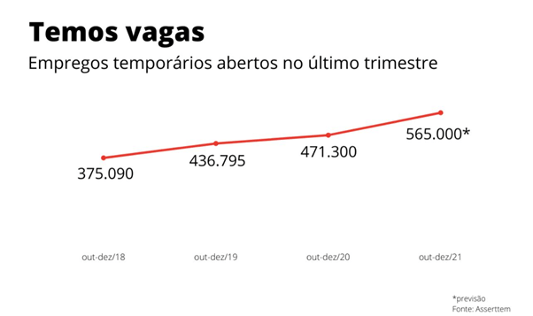 A Associação Brasileira do Trabalho Temporário (Asserttem) projeta alta de 20% na geração de empregos provisórios entre outubro e dezembro deste ano, na comparação com o mesmo período do ano passado, somando 565 mil novas oportunidades. O número mantém a expectativa de contratações acima do patamar pré-pandemia: em 2020, foram 471 mil, ante 436 mil em 2019. O fenômeno se explica pela maior facilidade de contratação de trabalhadores temporários em meio às incertezas geradas pela crise sanitária. Marcos de Abreu, presidente da entidade, afirma que os dados são conservadores e que o atual cenário permite margem para uma surpresa positiva no número de contratações. Ele cita a redução do temor de racionamento de energia, a retomada consistente do setor de serviços e o bom desempenho das commodities como bases para o sentimento otimista. “Os fatores que estavam nos limitando estão desaparecendo”, afirma. Além do cenário econômico, Abreu aponta o aumento do índice de transformação de vagas temporárias em postos efetivos. O índice de pessoas que superam o período provisório para conquistar a vaga efetiva está em 22%, ante 15% em 2018. “Não tenho dúvidas que no início de 2022 vamos estar em uma situação muito melhor do que a de 2021. Não iremos sofrer com a redução de vagas temporárias e efetivas.”