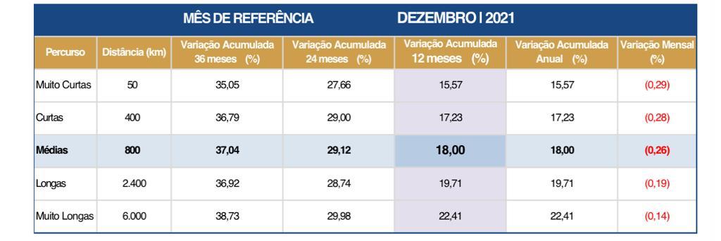 Seguindo a sistemática de apuração de índices que indicam o impacto da variação dos preços dos insumos do serviço de transporte rodoviário de cargas, o DECOPE/NTC registrou no ano de 2021 (e nos últimos 12 meses) uma inflação média para os serviços de transporte de cargas fracionadas de 18,0%.