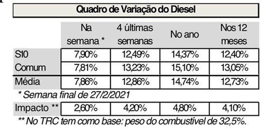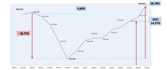 Em função desta decisão, o diesel que havia dado um alívio ao setor de transporte rodoviário, quando em maio de 2020 o preço do litro atingiu o menor nível do ano (R$ 3,106) com queda de 18,73%.