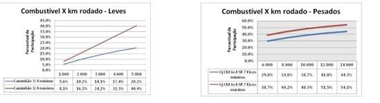 Os gráficos abaixo apresentam a participação do Diesel em função da variação da quilometragem rodada (custos só do veículo – sem considerar as despesas administrativas, os impostos e a margem de lucro).