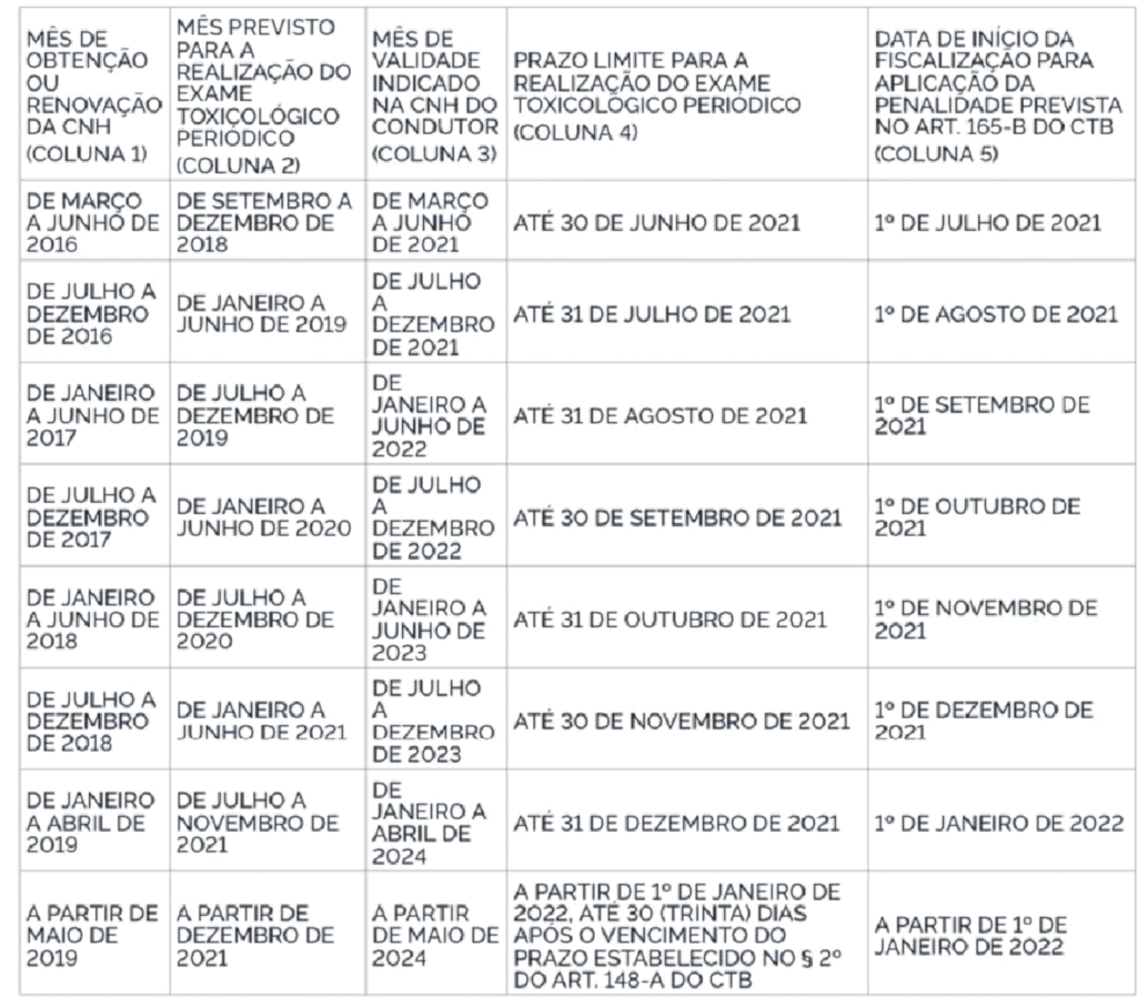 A exigência para o exame toxicológico, nos termos da Deliberação 222, de 27 de abril de 2021, publicada no D.O.U. de hoje, para fins de aplicação da penalidade prevista no caput do art. 165-B do CTB, será estabelecida em função do mês da data de validade indicada na CNH do condutor, de forma escalonada, conforme disposto no Anexo VII desta Resolução, iniciando em junho de até dezembro deste ano.