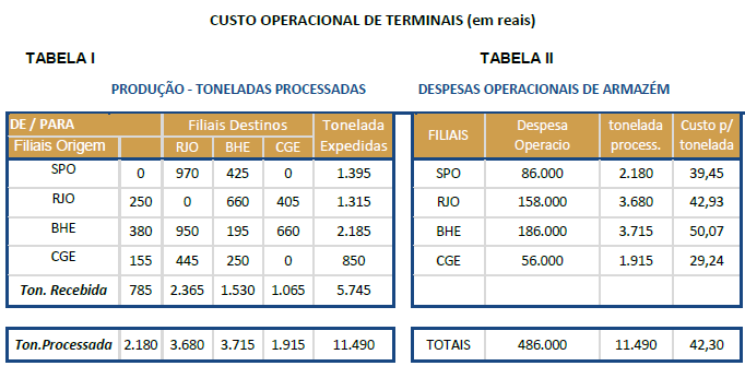 A partir da identificação dos dois centros de custos (Administração e Operação de Terminais), é necessário apropriar despesas a cada um deles.