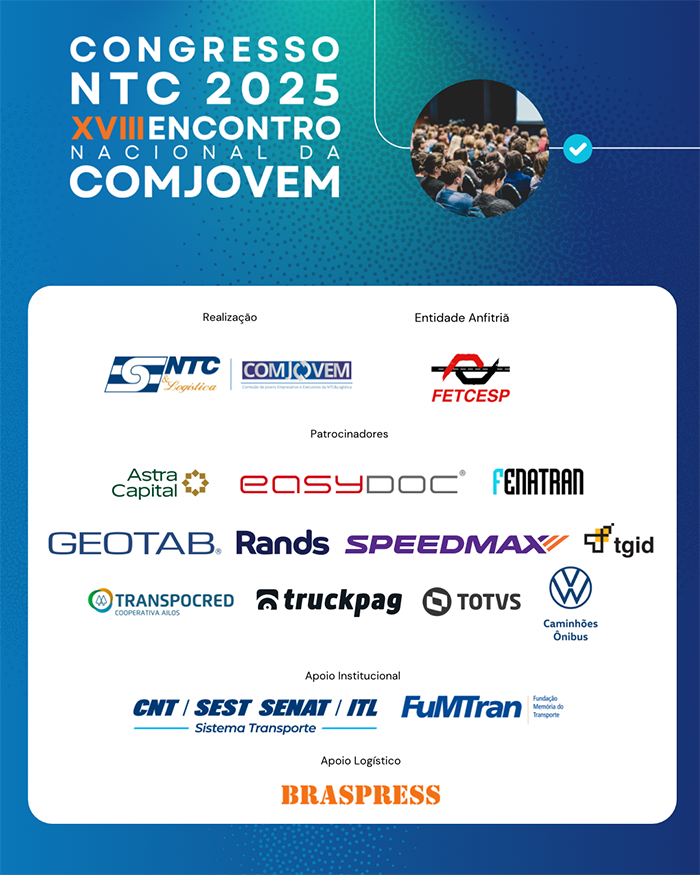 As inscrições estão abertas para o Congresso NTC 2025 – XVIII Encontro Nacional da COMJOVEM (Comissão de Jovens Empresários e Executivos da NTC&Logística). O evento, que reúne empresários do Transporte Rodoviário de Cargas de todo o Brasil, será realizado no Club Med Lake Paradise, em Mogi das Cruzes (SP), entre os dias 27 e 30 de novembro.