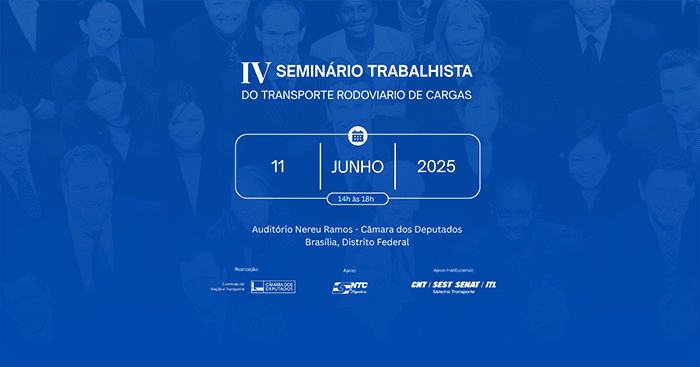 O IV Seminário Trabalhista do Transporte Rodoviário de Cargas será realizado no dia 11 de junho de 2025, às 14 horas, no Auditório Nereu Ramos, da Câmara dos Deputados, em Brasília. A iniciativa é organizada pela Comissão de Trabalho da Câmara, com o apoio e sugestão da NTC&Logística – Associação Nacional do Transporte de Cargas e Logística, e apoio institucional do Sistema Transporte (CNT – Confederação Nacional do Transporte / SEST SENAT – Serviço Social do Transporte e Serviço Nacional de Aprendizagem do Transporte / ITL – Instituto de Transporte e Logística).
