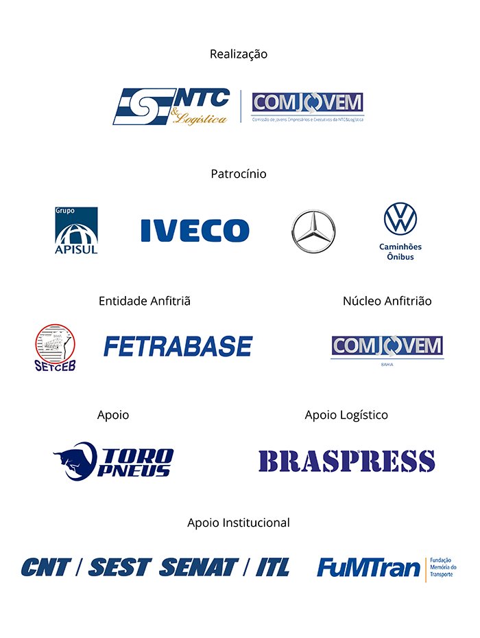 O Seminário Itinerante – Edição Bahia é uma realização da NTC&Logística por meio do Núcleo COMJOVEM Bahia, tendo como entidades anfitriãs o SETCEB e a Fetrabase, com o patrocínio da Apisul, IVECO e Mercedes Benz, apoio logístico da Braspress, e o apoio institucional da CNT/SEST SENAT/ITL e da FUMTRAN.