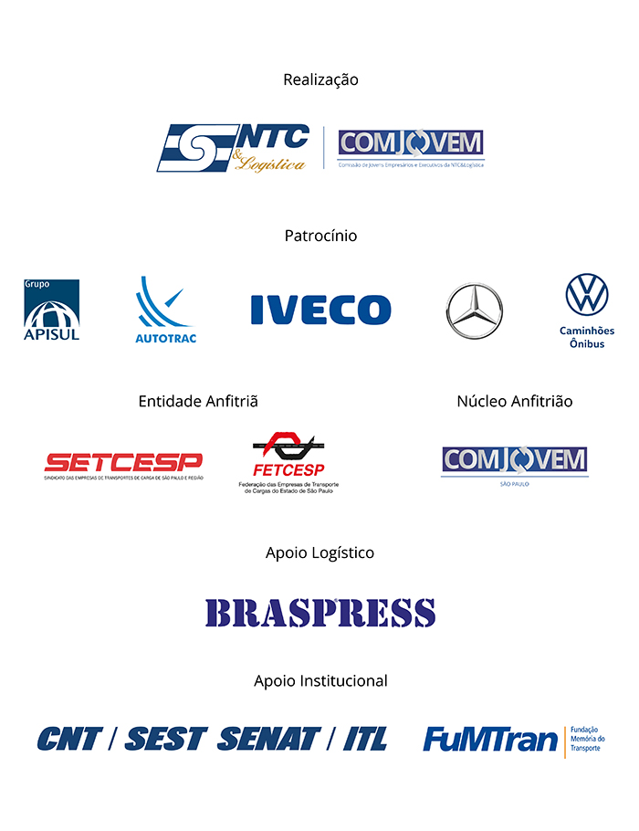 O Seminário Itinerante – Edição São Paulo é uma realização da NTC&Logística por meio do Núcleo COMJOVEM São Paulo, tendo como entidades anfitriãs o SETCESP e a Fetcesp, com o patrocínio da Apisul, Autotrac, IVECO, Mercedes-Benz e Volkswagen Caminhões e Ônibus, apoio logístico da Braspress, e o apoio institucional da CNT/SEST SENAT/ITL e da FUMTRAN.