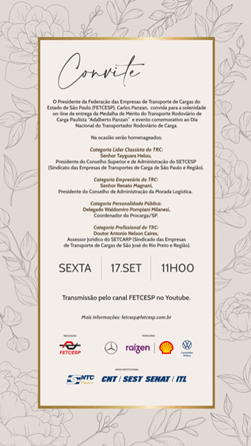 Neste ano a FETCESP realiza a entrega da Medalha de Mérito do Transporte Rodoviário de Carga Paulista “Adalberto Panzan” exatamente no Dia Nacional do Transportador Rodoviário de Carga, 17 de setembro (sexta-feira), a partir das 11 horas, no Canal FETCESP no Youtube.