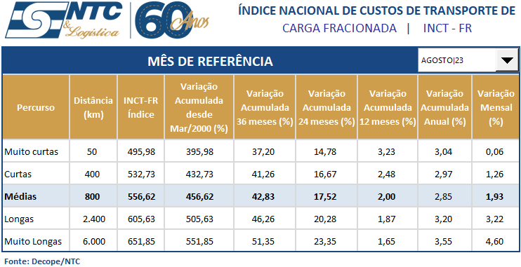 O INCT-FR mede a evolução de todos os custos da carga fracionada na operação rodoviária, sendo assim incluindo-se transferência, custos de administração e de terminais (custos indiretos), gerenciamento de riscos e custo valor. Nesses custos não estão contemplados impostos, pedágios e margem de lucro.