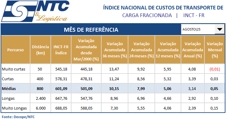 INCT-FR | Índice Nacional do Custo do Transporte de Carga Fracionada – Operação Rodoviária | Agosto/25