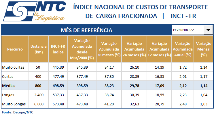 INCT-FR | Índice Nacional do Custo do Transporte de Carga Fracionada – Operação Rodoviária | Fevereiro/22