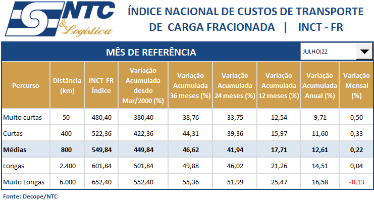INCT-FR | Índice Nacional do Custo do Transporte de Carga Fracionada – Operação Rodoviária | Julho/22