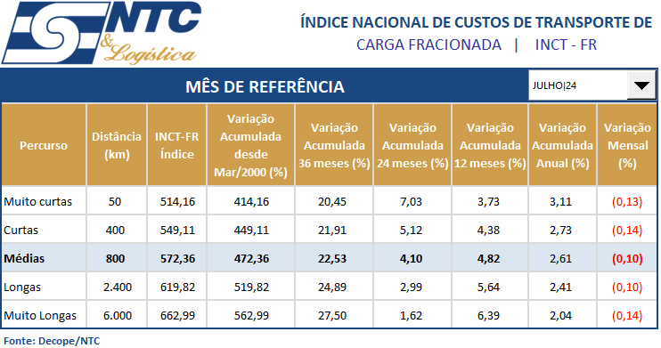 INCT-FR | Índice Nacional do Custo do Transporte de Carga Fracionada – Operação Rodoviária | Julho/24