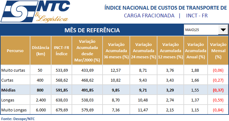 INCT-FR | Índice Nacional do Custo do Transporte de Carga Fracionada – Operação Rodoviária | Maio/25