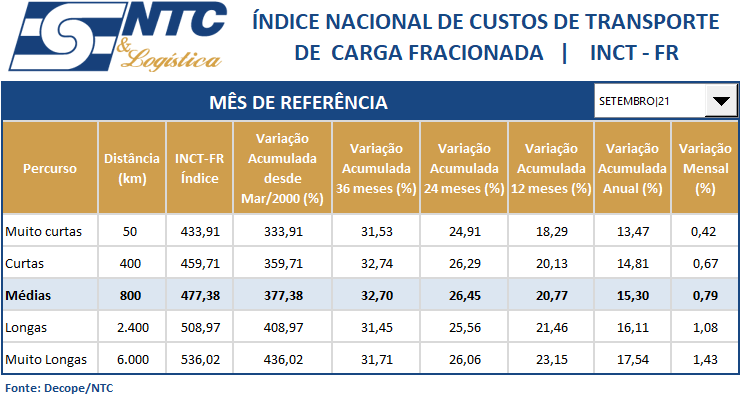 INCT-FR | Índice Nacional do Custo do Transporte de Carga Fracionada – Operação Rodoviária | Setembro/21