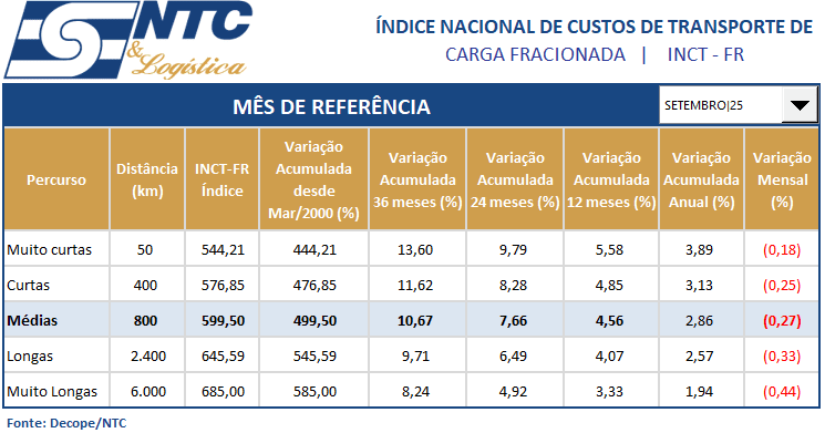 INCT-FR | Índice Nacional do Custo do Transporte de Carga Fracionada – Operação Rodoviária | Setembro/25