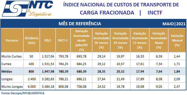 O INCTF mede a evolução de todos os custos da carga fracionada, incluindo transferência, coleta e distribuição, custos administração e de terminais.