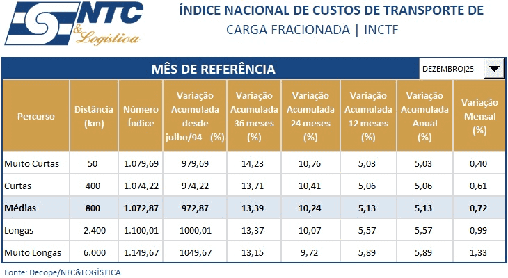 O INCTF mede a evolução de todos os custos da carga fracionada, incluindo transferência, coleta e distribuição, custos administração e de terminais (custos indiretos), gerenciamento de riscos e custo valor. Nesses custos não estão contemplados impostos, pedágios e margem de lucro.