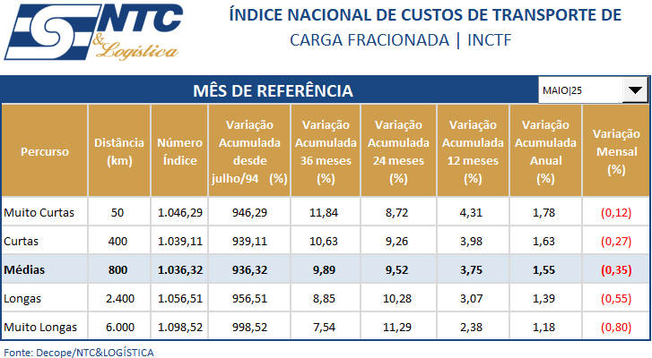 O INCTF mede a evolução de todos os custos da carga fracionada, incluindo transferência, coleta e distribuição, custos administração e de terminais (custos indiretos), gerenciamento de riscos e custo valor. Nesses custos não estão contemplados impostos, pedágios e margem de lucro.