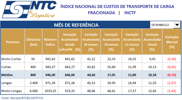 INCTF | Índice Nacional de Custos do Transporte de Carga Fracionada – Setembro/22