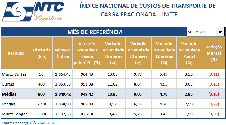 INCTF | Índice Nacional de Custos do Transporte de Carga Fracionada – Setembro/25