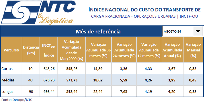 INCTF-OU | Índice Nacional do Custo do Transporte de Carga Fracionada – Operações Urbanas – Agosto/24
