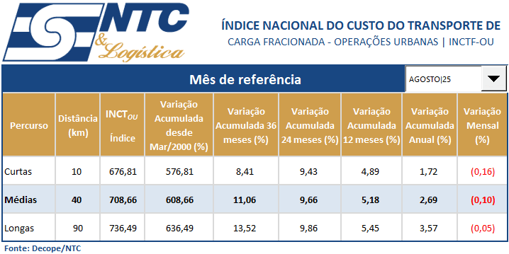 INCTF-OU | Índice Nacional do Custo do Transporte de Carga Fracionada – Operações Urbanas – Agosto/25