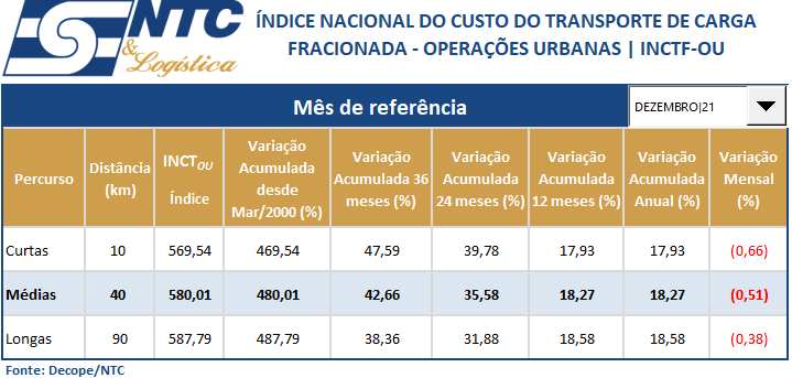 INCTF-OU | Índice Nacional do Custo do Transporte de Carga Fracionada – Operações Urbanas – Dezembro/21