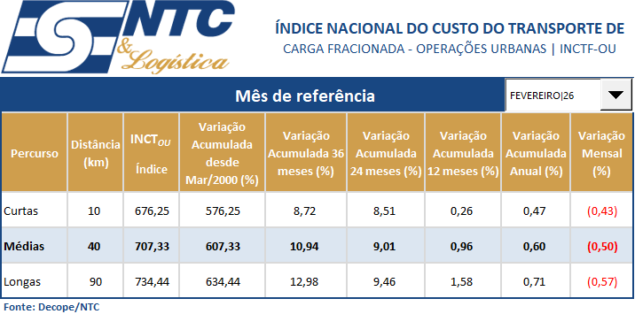 O INCTF-OU mede a evolução de todos os custos da carga fracionada na operação urbana, incluindo coleta, distribuição, custos de administração e de terminais (custos indiretos), gerenciamento de riscos e custo valor. Nesses custos não estão contemplados impostos, pedágios e margem de lucro.