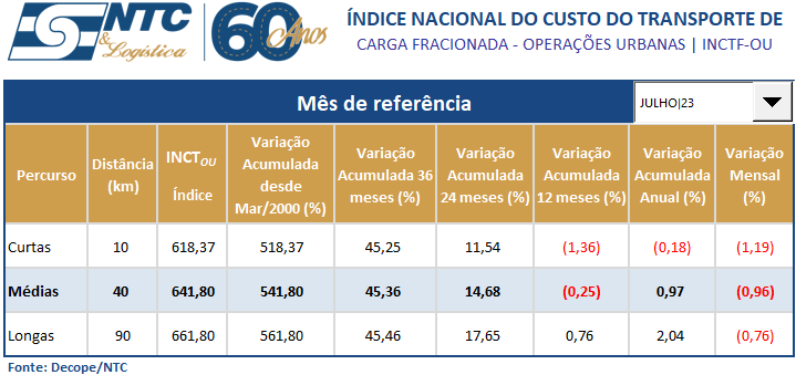 INCTF-OU | ÍNDICE NACIONAL DO CUSTO DO TRANSPORTE DE CARGA FRACIONADA – OPERAÇÕES URBANAS – JULHO/23
