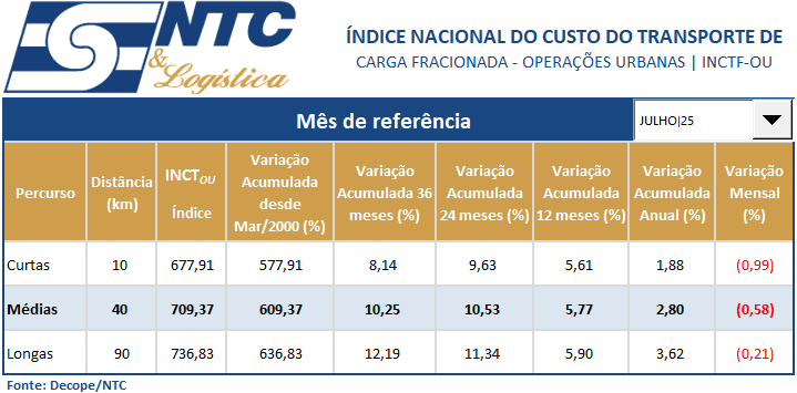 INCTF-OU | Índice Nacional do Custo do Transporte de Carga Fracionada – Operações Urbanas – Julho/25