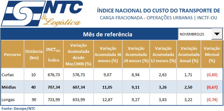 INCTF-OU | Índice Nacional do Custo do Transporte de Carga Fracionada – Operações Urbanas – Novembro/25