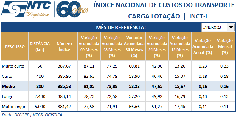 O INCTL reflete a variação dos custos do transporte rodoviário de cargas fechadas ou lotações, ou seja, ele mede a evolução de todos os custos da carga completa, incluindo a transferência, a administração (custos indiretos), gerenciamento de riscos e custo valor. Ele, assim como o INCTF, também não contempla impostos e margem de lucro na sua apuração.