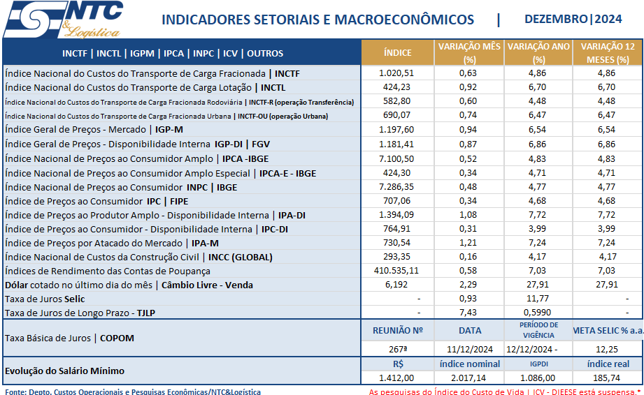 Os indicadores setoriais e macroeconômicos permitem aos empresários, principalmente, os de transporte, o acompanhamento da evolução da inflação no setor do transporte rodoviário de cargas, e, sobretudo, dos principais indicadores macroeconômicos para a tomada de decisão.
