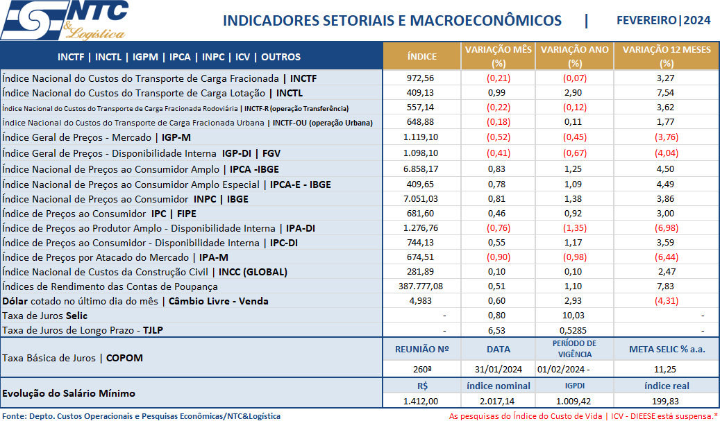 Os indicadores setoriais e macroeconômicos permitem aos empresários, principalmente, os de transporte, o acompanhamento da evolução da inflação no setor do transporte rodoviário de cargas, e, sobretudo, dos principais indicadores macroeconômicos para a tomada de decisão.