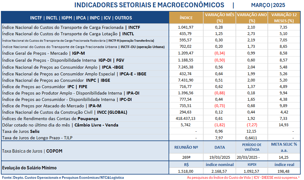 Os indicadores setoriais e macroeconômicos permitem aos empresários, principalmente, os de transporte, o acompanhamento da evolução da inflação no setor do transporte rodoviário de cargas, e, sobretudo, dos principais indicadores macroeconômicos para a tomada de decisão.