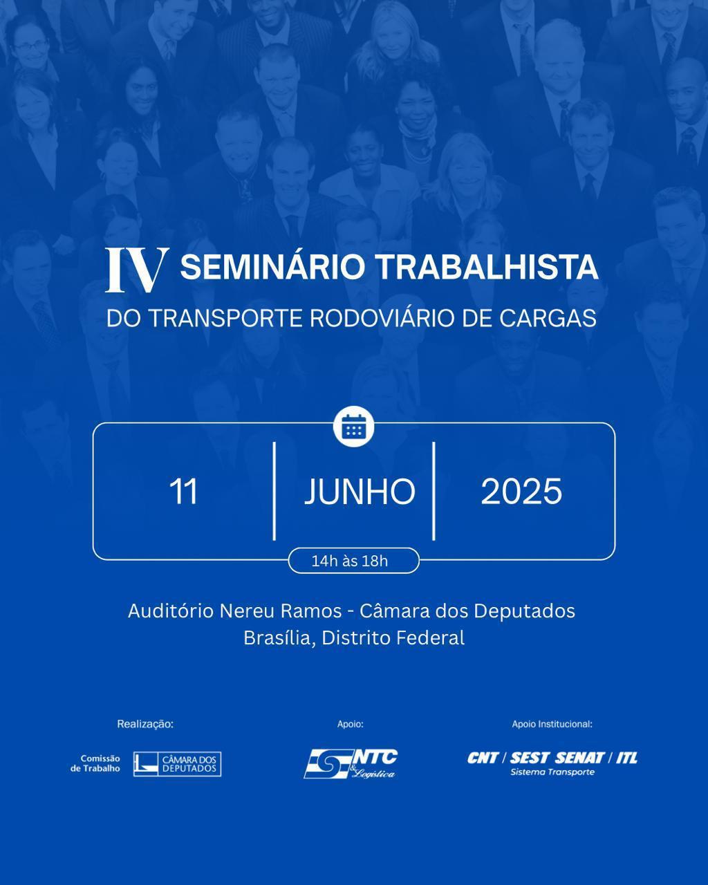 O IV Seminário Trabalhista do Transporte Rodoviário de Cargas será realizado no dia 11 de junho de 2025, às 14 horas, no Auditório Nereu Ramos, da Câmara dos Deputados, em Brasília. A iniciativa é organizada pela Comissão de Trabalho da Câmara, com o apoio e sugestão da NTC&Logística – Associação Nacional do Transporte de Cargas e Logística, e apoio institucional do Sistema Transporte (CNT – Confederação Nacional do Transporte / SEST SENAT – Serviço Social do Transporte e Serviço Nacional de Aprendizagem do Transporte / ITL – Instituto de Transporte e Logística).