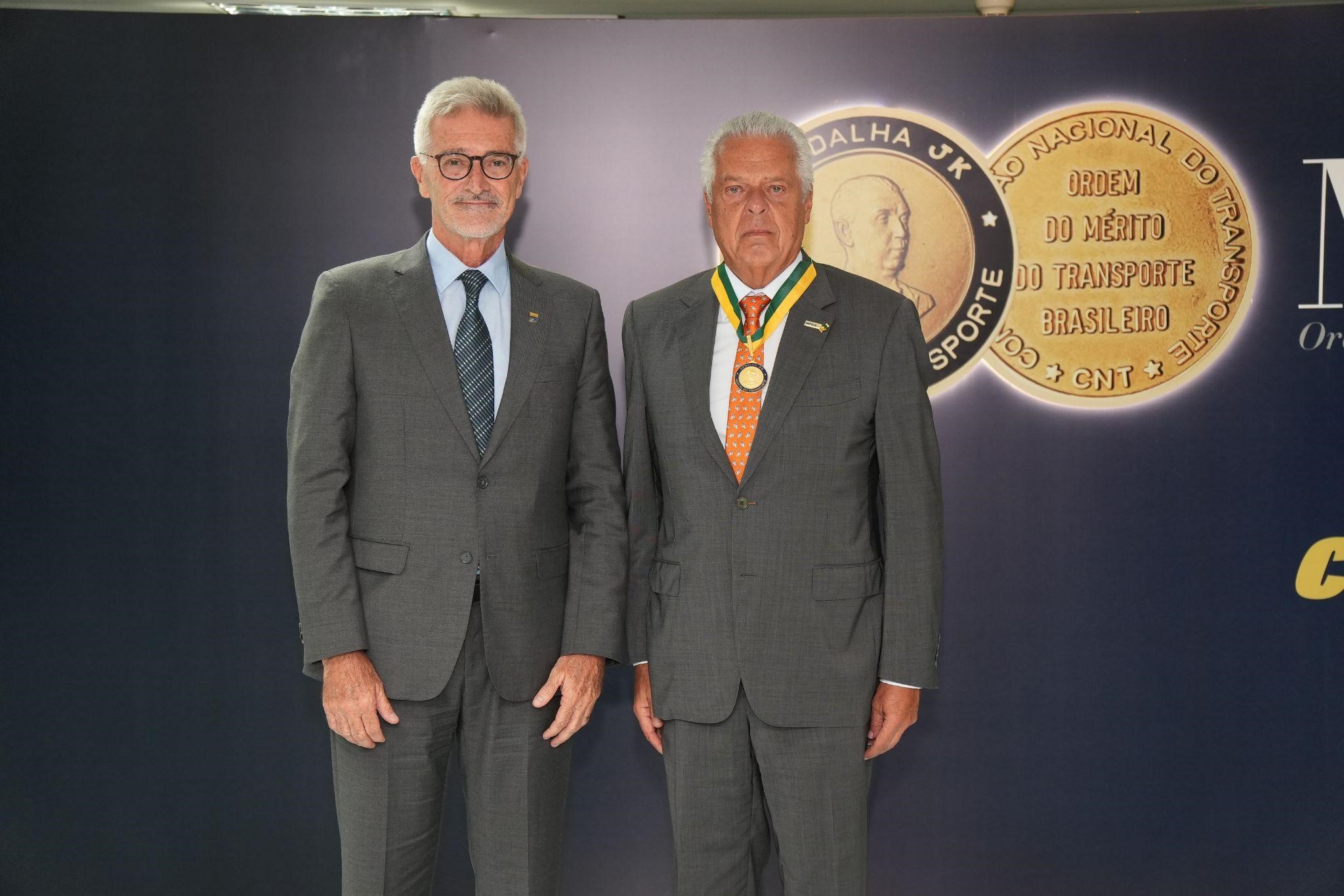O presidente da NTC&Logística, Eduardo Rebuzzi, que também preside a Seção II – do Transporte Rodoviário de Cargas da CNT, entregou a Medalha JK no grau Grande Oficial ao presidente da INFRA S.A., Jorge Bastos – ex-diretor-geral da Agência Nacional de Transportes Terrestres (ANTT) e ex-diretor-presidente da Empresa de Planejamento e Logística (EPL) –, pela notável e comprovada experiência como gestor no setor de transporte.