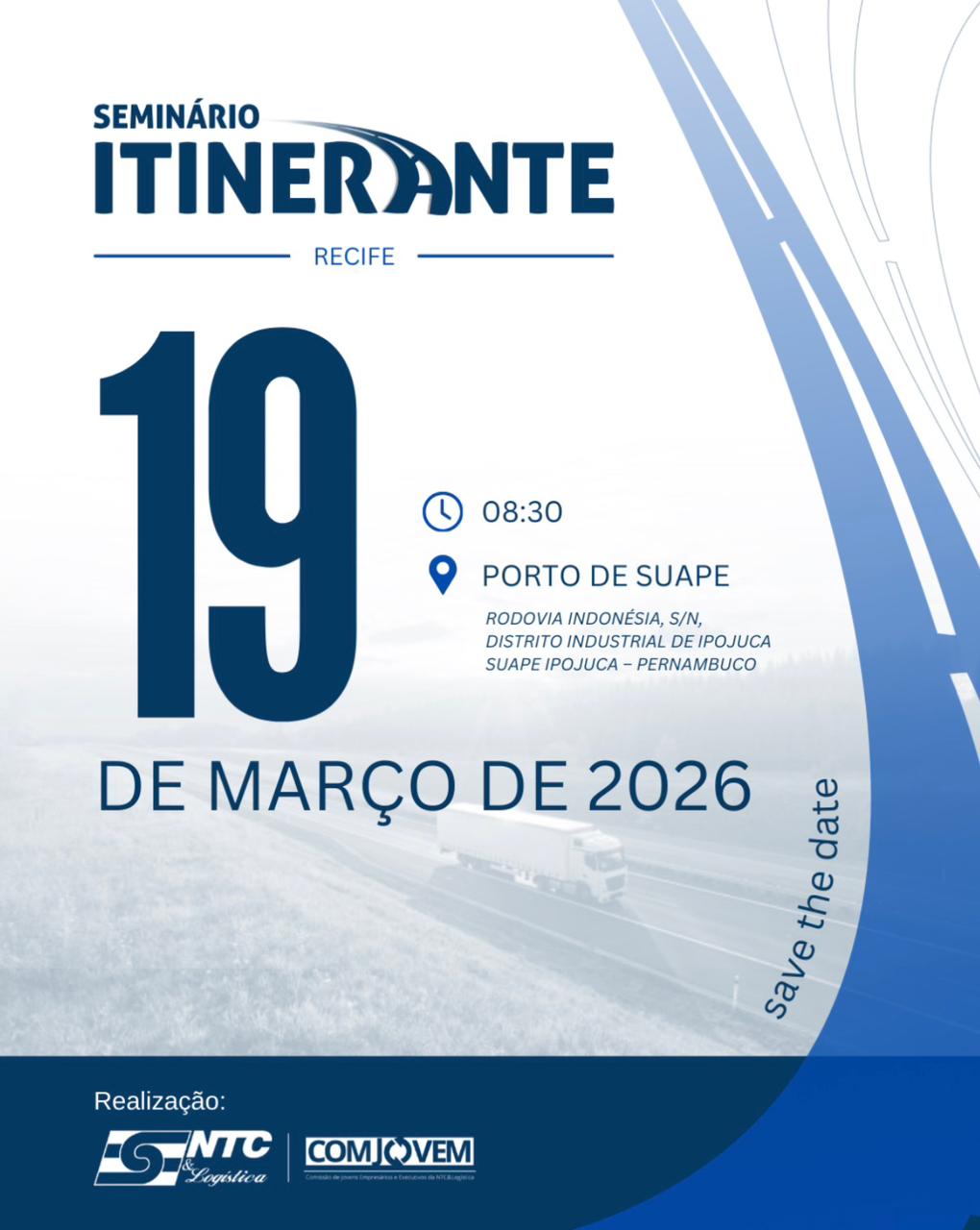 A primeira edição de 2026 do Seminário Itinerante da NTC&Logística ocorrerá no estado de Pernambuco, recepcionada pela Federação das Empresas de Transporte de Cargas e Logística do Nordeste – FETRACAN, pelo Sindicato das Empresas de Transporte de Cargas, Entregas, Armazenagem e Logística do Estado de Pernambuco – SETCEPE e pelo Núcleo da COMJOVEM Recife, no dia 19 de março, às 8h30, no Complexo Industrial Portuário de Pernambuco