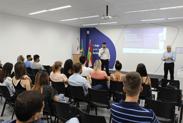 “O sucesso não vem de imediato quando você resolve empreender. É preciso tempo. É preciso coragem pra empreender, paciência para esperar acontecer e persistência, porque desistir é uma palavra que não pertence ao dicionário de um empresário bem sucedido”. Esta foi a síntese da mensagem transmitida pelo presidente da Fetrancesc, Ari Rabaiolli, durante palestra para alunos do curso de Direito da Unisul, em Florianópolis, nesta quinta-feira, 25 de novembro.