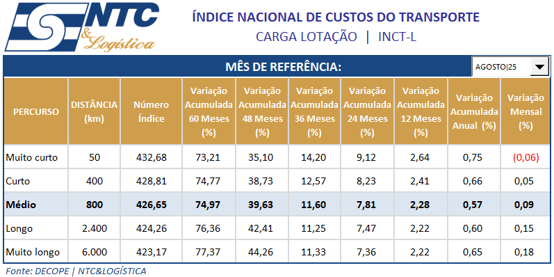 A NTC&LOGÍSTICA comunica aos associados que a variação média do (INCTF[1] DECOPE/NTC) foi de (0,03%) no mês de agosto e acumula nos últimos doze meses 5,03% (cinco virgula zero três por cento), entre setembro de 2024 e agosto de 2025 (agosto de 2025*/- sobre agosto de 2024 ou ainda, nos últimos doze meses).