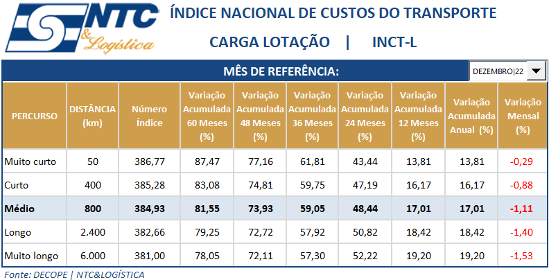 A NTC&LOGÍSTICA comunica aos associados que a variação média do(INCTF[1] DECOPE/NTC) foi de (0,63%) no mês de dezembro e acumula nos últimos doze meses 10,60% (dez virgula sessenta por cento), entre janeiro de 2022 e dezembro de 2022 (dezembro de 2022*/- sobre dezembro de 2021 ou ainda, nos últimos doze meses).