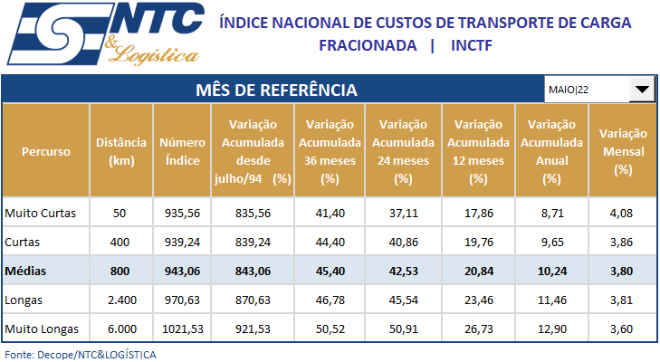 A NTC&LOGÍSTICA comunica aos associados que a variação média do (INCTF[1] DECOPE/NTC) foi de 3,80% no mês de abril e acumula nos últimos doze meses 20,84% (vinte virgula oitenta e quatro por cento), entre junho de 2021 e maio de 2022 (maio de 2022*/- sobre maio de 2021 ou ainda, nos últimos doze meses).